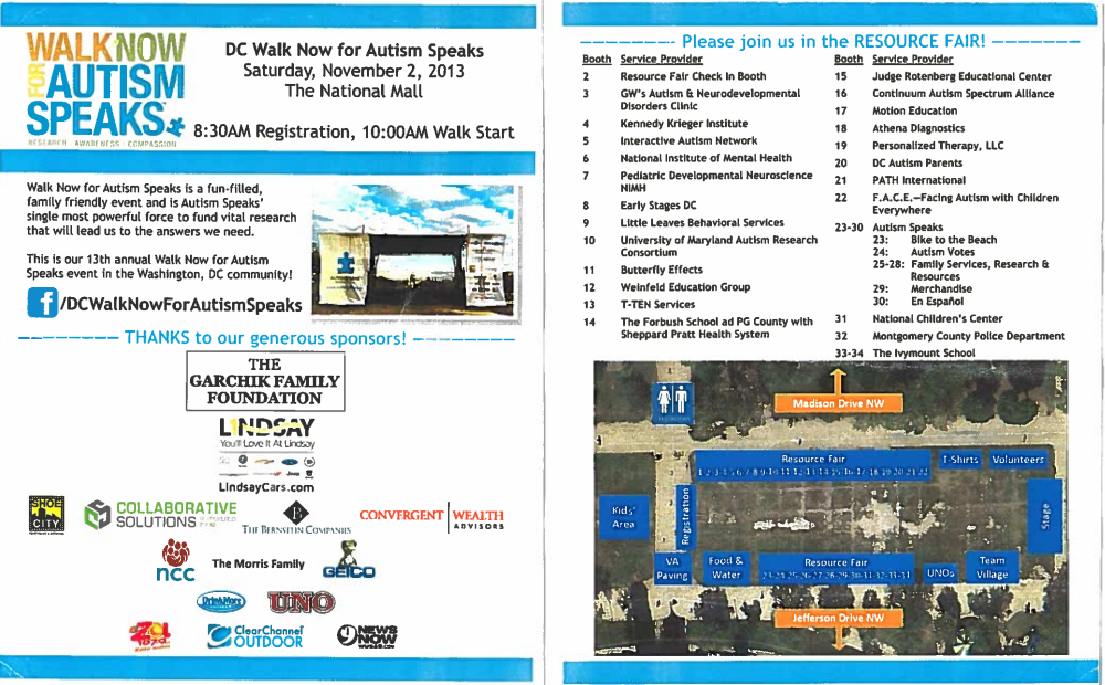 Image description: Two scanned images of a hand-held printed card are side by side. The background of both is white. The front side bears the Walk Now for Autism Speaks logo, with the motto, Research Awareness, Compassion, beside the event information — DC Walk Now for Autism Speaks Saturday November 2, 2013 The National Mall, 8:30AM Registration, 10:00AM Walk Start. Then there is more text, "Walk Now for Autism Speaks is a fun-filled, family friendly event and is Autism Speaks' single most powerful force to fund vital research that will lead us to the answers we need. This is our 13th annual Walk Now for Autism Speaks event in the Washington, DC community!" Then a picture of a tend with a big Autism Speaks banner. Then "thanks to our generous sponsors" followed by a variety of foundation and corporate logos. The back side of the card bears a header that says "Please join us in the RESOURCE Fair!" and has two columns under that, one with booth number, and one labeled Service Provider. There are 34 booths numbered, belonging to various autism-related organizations, centers, or service providers. Number 15, which is at the top of the second column, is the Judge Rotenberg Educational Center. Beneath the list is a satellite image of the walk area with various stations labeled.